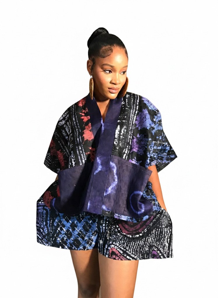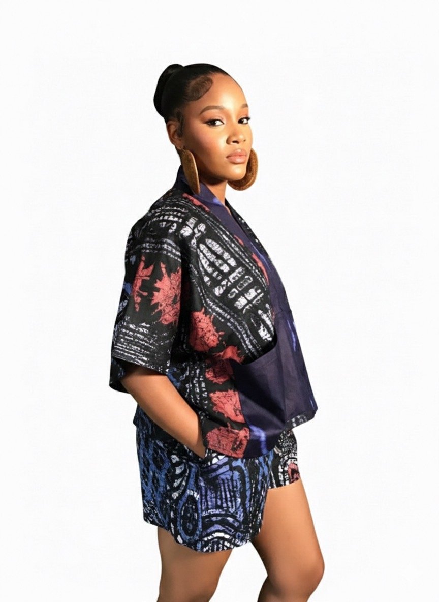 The Ada Short Set brings vibrant Ankara cotton to life in a chic and versatile ensemble. Its bold, colourful patterns pair effortlessly with sneakers for a playful day out or with slippers for relaxed elegance at home.