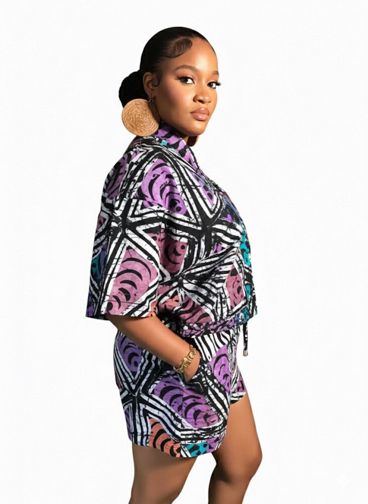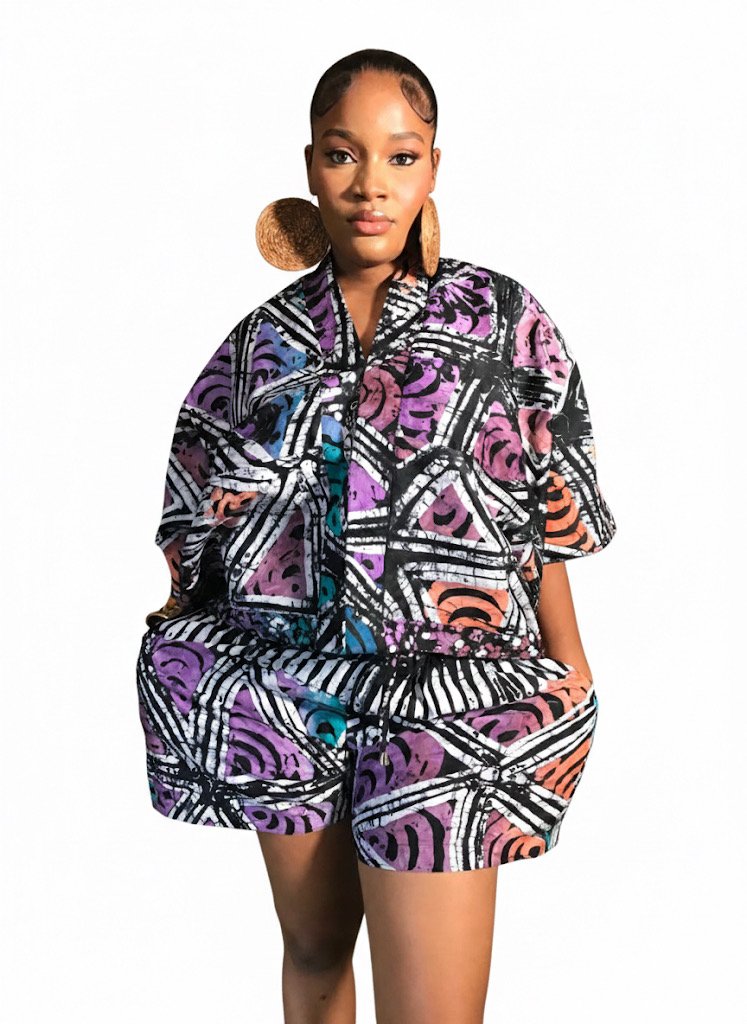 The Bibi Short Set brings vibrant Ankara cotton to life in a chic and versatile ensemble. Its bold, colourful patterns pair effortlessly with sneakers for a playful day out or with slippers for relaxed elegance at home.
