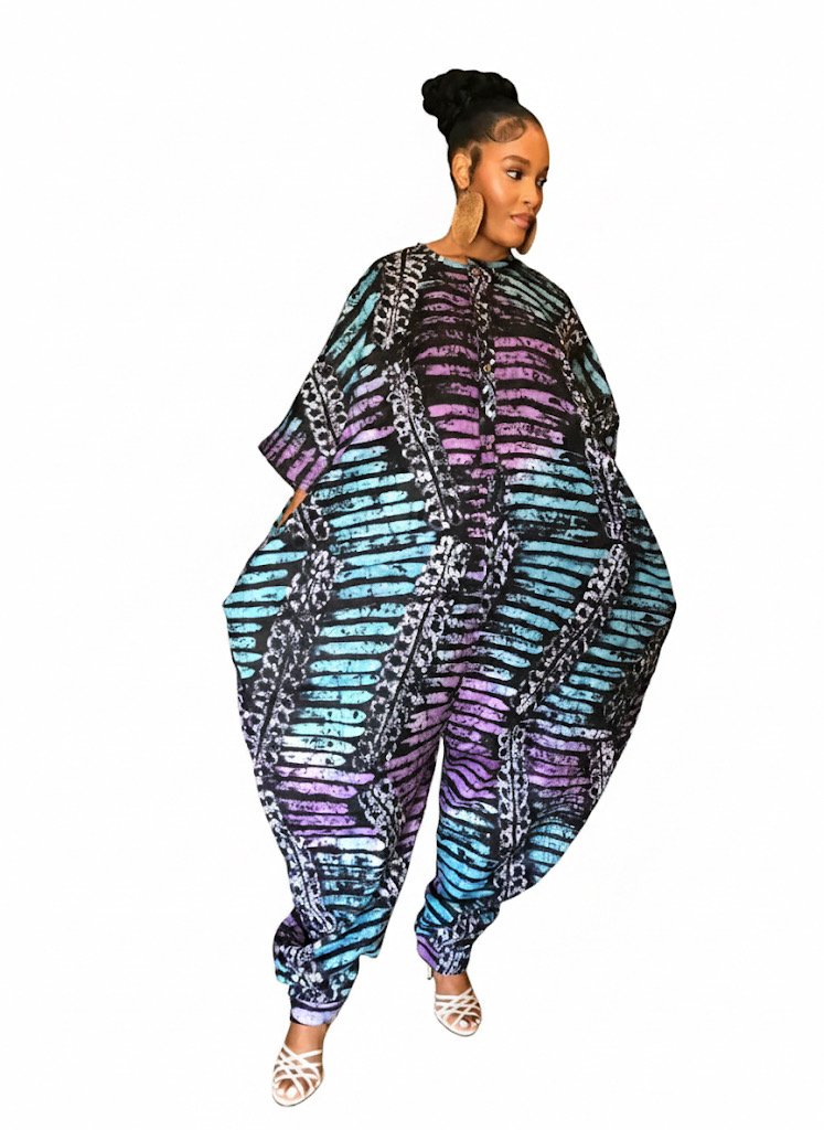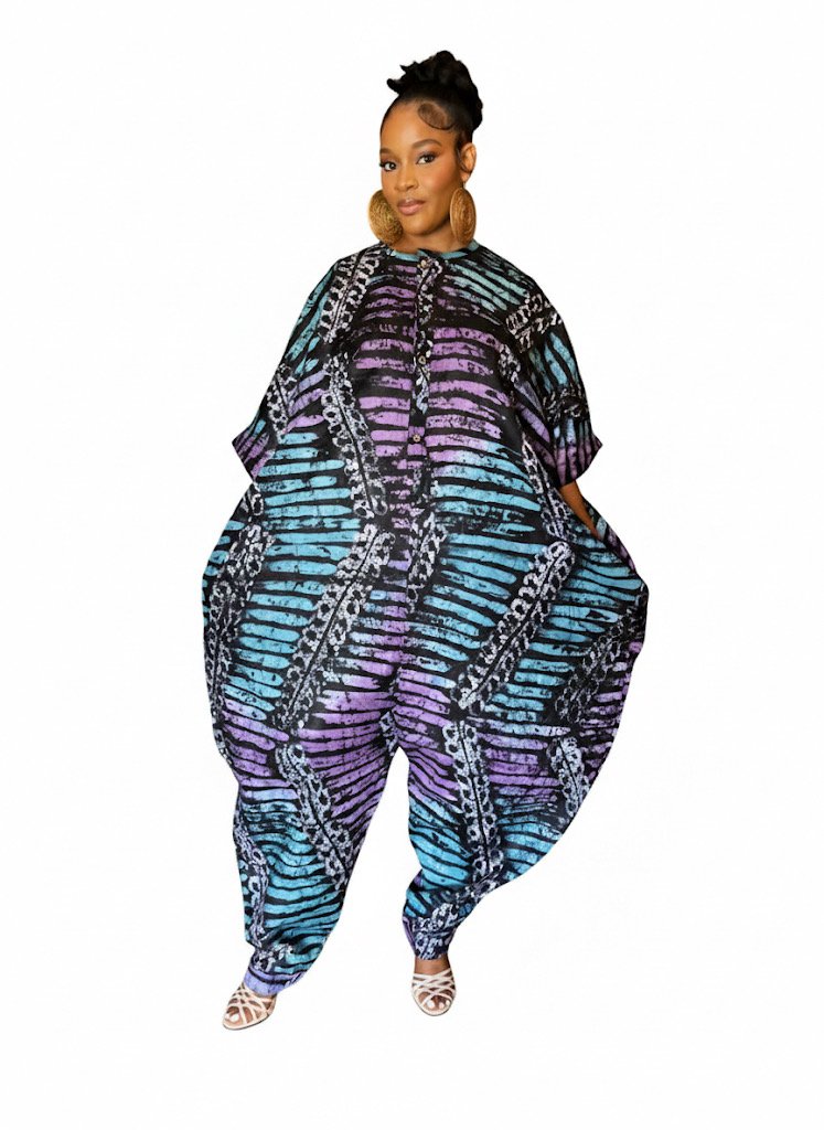 Embrace boldness and sophistication in this luxury Adire jumpsuit, a must-have for every stylish wardrobe. Made from rich, vibrant African fabric, its free-size silhouette flows effortlessly, offering both comfort and statement-making style. Ideal for any occasion, dress it up or down with sneakers, sandals, or heels. Celebrate your confidence, chic elegance, and the vibrant spirit of African artistry with this standout piece.