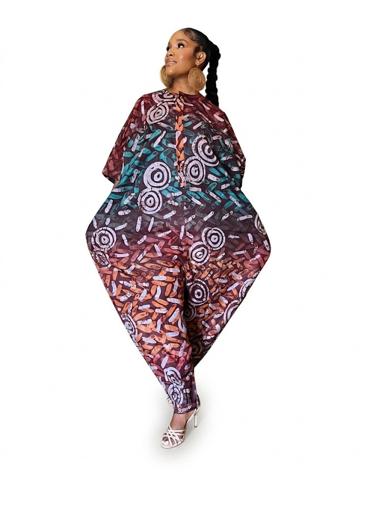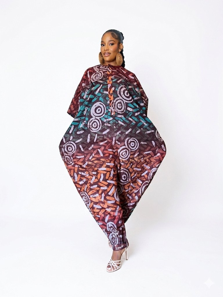 Step into bold sophistication with the D’Onyx Sunset Dynasty Adire Jumpsuit, a stunning statement piece that blends traditional African artistry with modern luxury. Featuring rich sunset tones of burnt orange, deep brown, and teal, this elegant Adire jumpsuit showcases a dramatic flowing silhouette designed for both comfort and style.